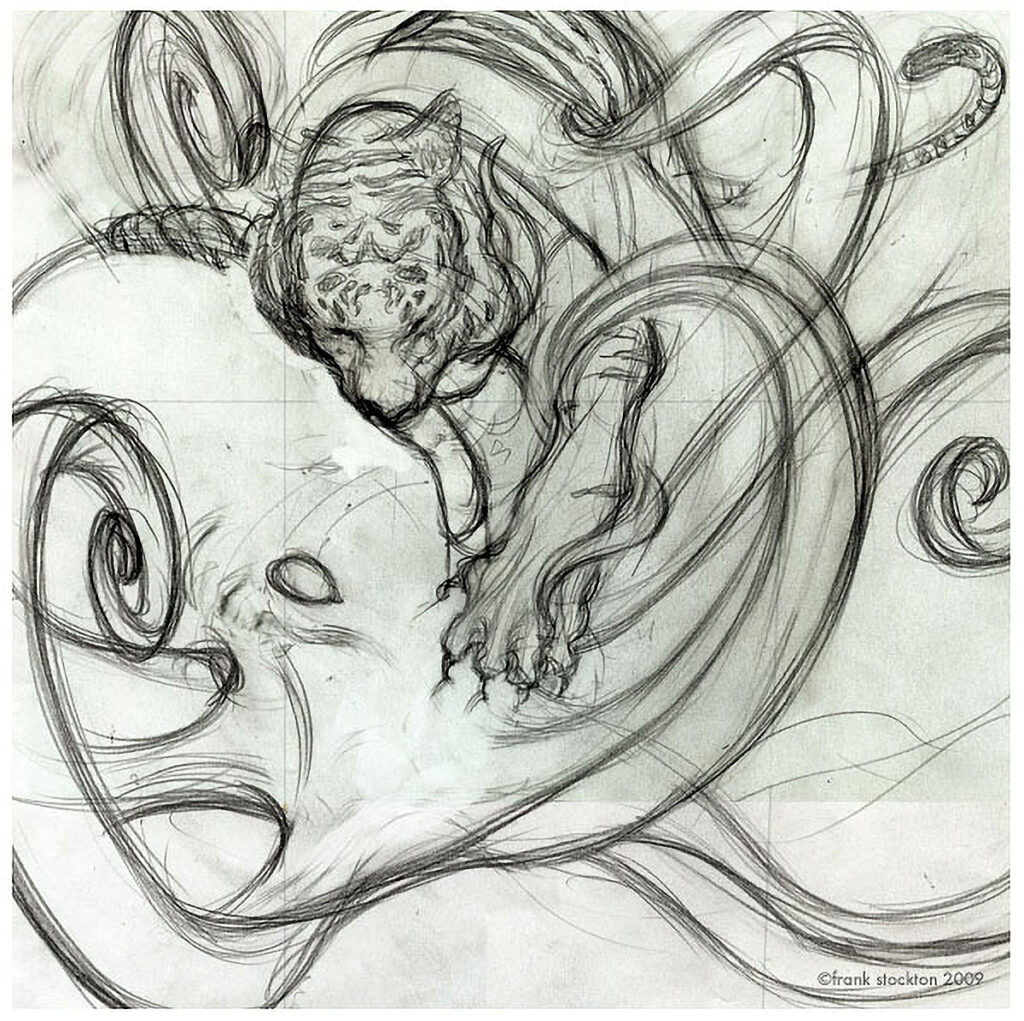 I blew up the loose sketch from yesterday, then drew it a bit tighter on the light table. The Tiger and Octopus were drawn on separate pieces of paper and put together in photoshop. It’s still not quite there, a lot of details are missing, but I’ll get to those tomorrow.