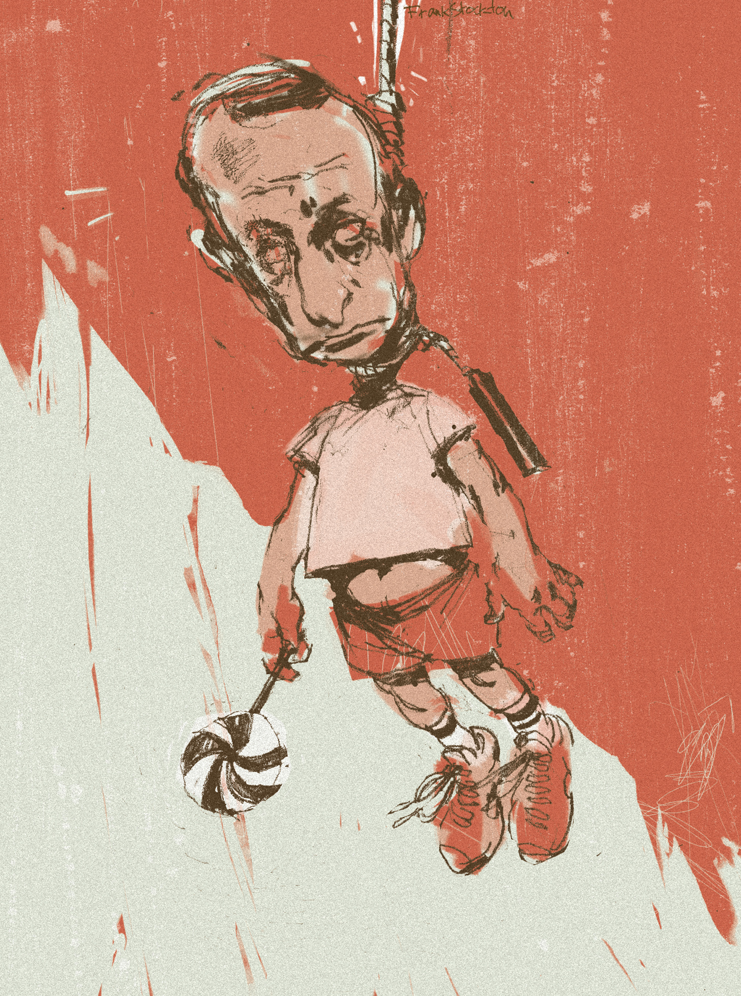 In the Fall of 2005 I was commissioned by the Russian Esquire to make 30 illustrations of things Russia leads the world in. One condition the publication asked for was that each illustration had a caricature of Vladmir Putin as the visual metaphor for Russia. Originally I was commissioned to make just one illustration for the article, in which they asked if I could illustrate the theme “child suicide” by putting Putin’s head on a child’s body and hanging it from a noose. While I didn’t personally like that solution at all (and never show that particular piece for that reason), I nevertheless still did it, because as a recent graduate of an arts program facing over $800 per month in loan repayments I took whatever I could get.