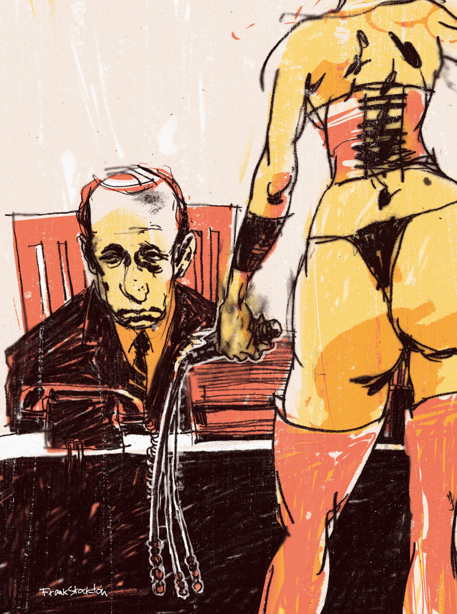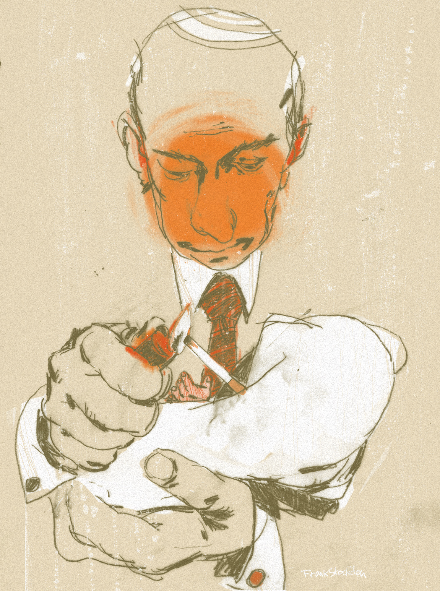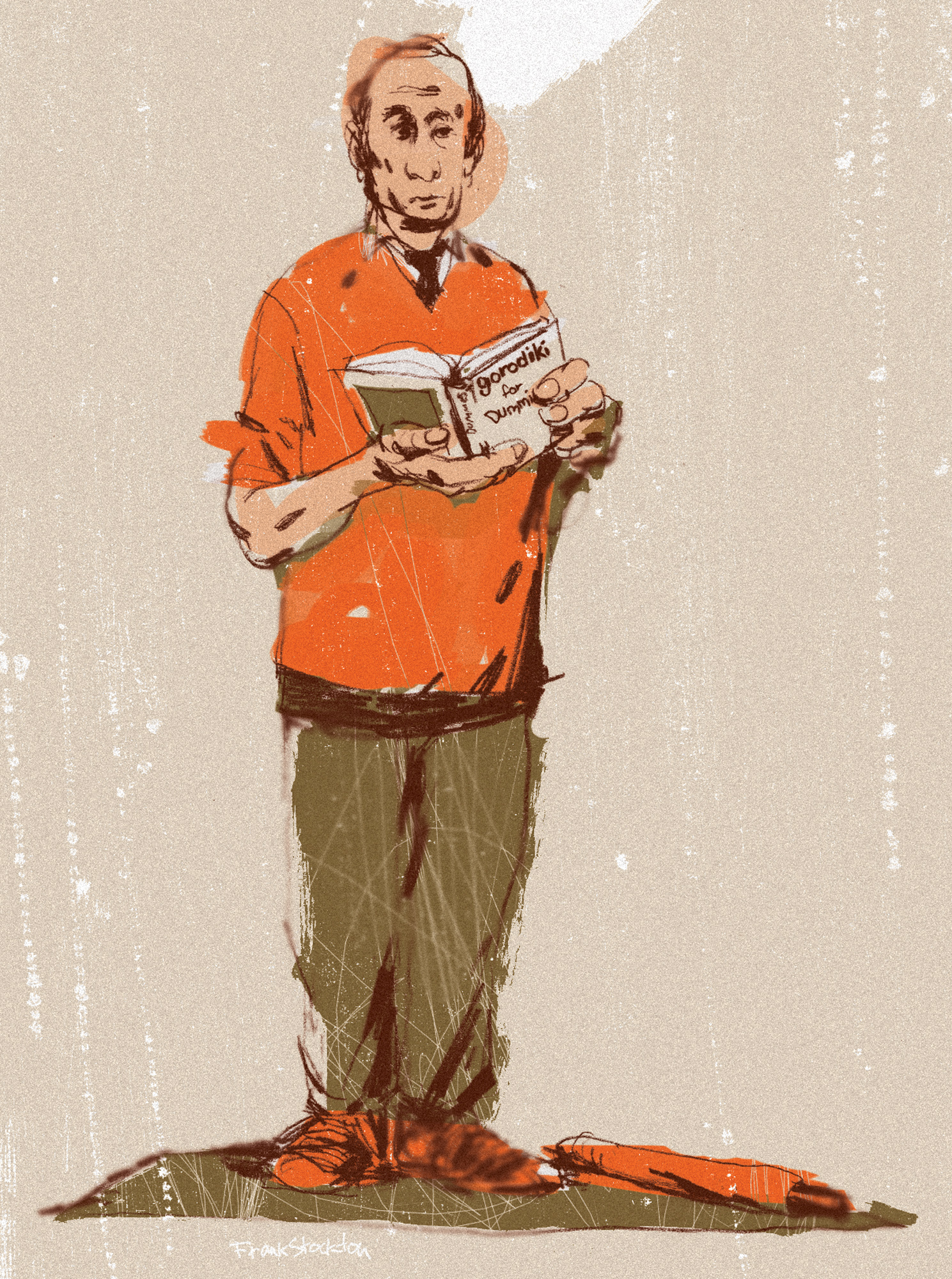 “In the Russian analogue of U.S. Esquire’s Dubious Achievements section, East Village illustrator Frank Stockton recently portrayed Putin as a bouncer-like skinhead and as a hung corpse. Bold provocations — and yet no reaction from Putin’s administration followed.”