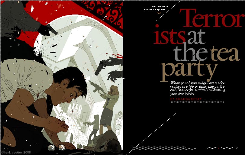 Anyhow, in this particular illustration I was trying to focus on the phenomenon of time slowing down while under extreme stress. To achieve this I wanted to have things like bullets suspended in mid air and lots of pictorial depth. I wanted to show a “moment in time” that I wouldn’t normally illustrate. The goal was something that felt like frozen movement instead of action movement.