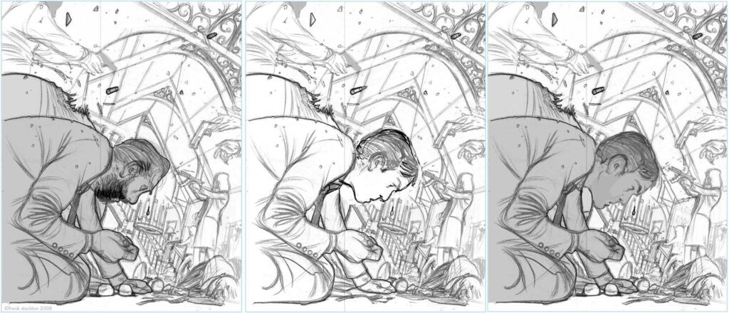 Those drawings are gorgeous and–thorough. Each drawing is almost completely resolved–you could pop any one of those under a light table and easily start inking. I’m impressed with how effortlessly you put depth into your images–your perspective is awesome, and you just keep getting better and better. I look forward to every new piece.