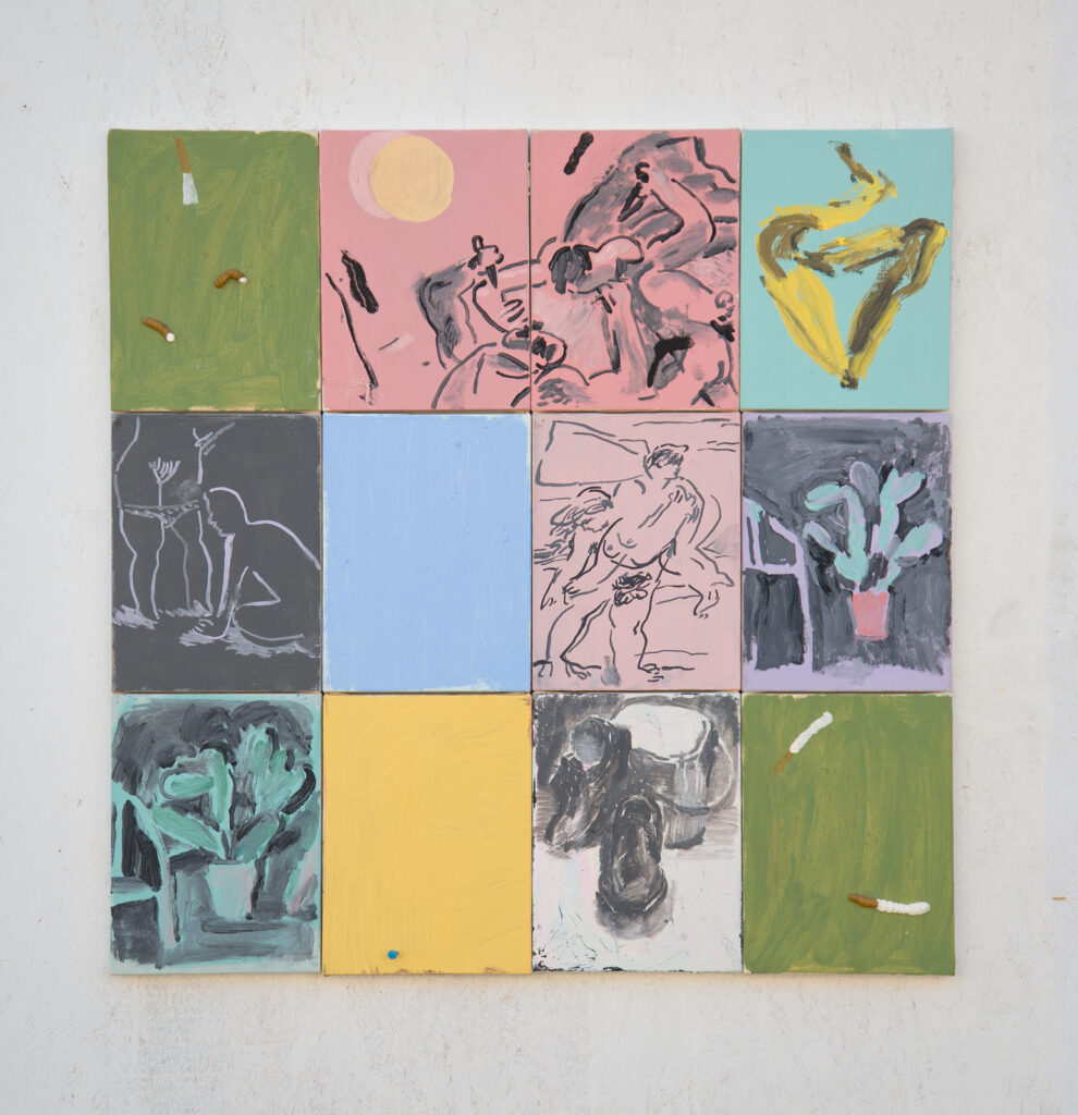 I call some of the recent work “gutter” paintings, which is a reference to the the gap between cells in a comic strip. These larger pieces are constructions of many small canvases clustered into a grid formation that may suggest a spatial, narrative, or symbolic meaning to the viewer.