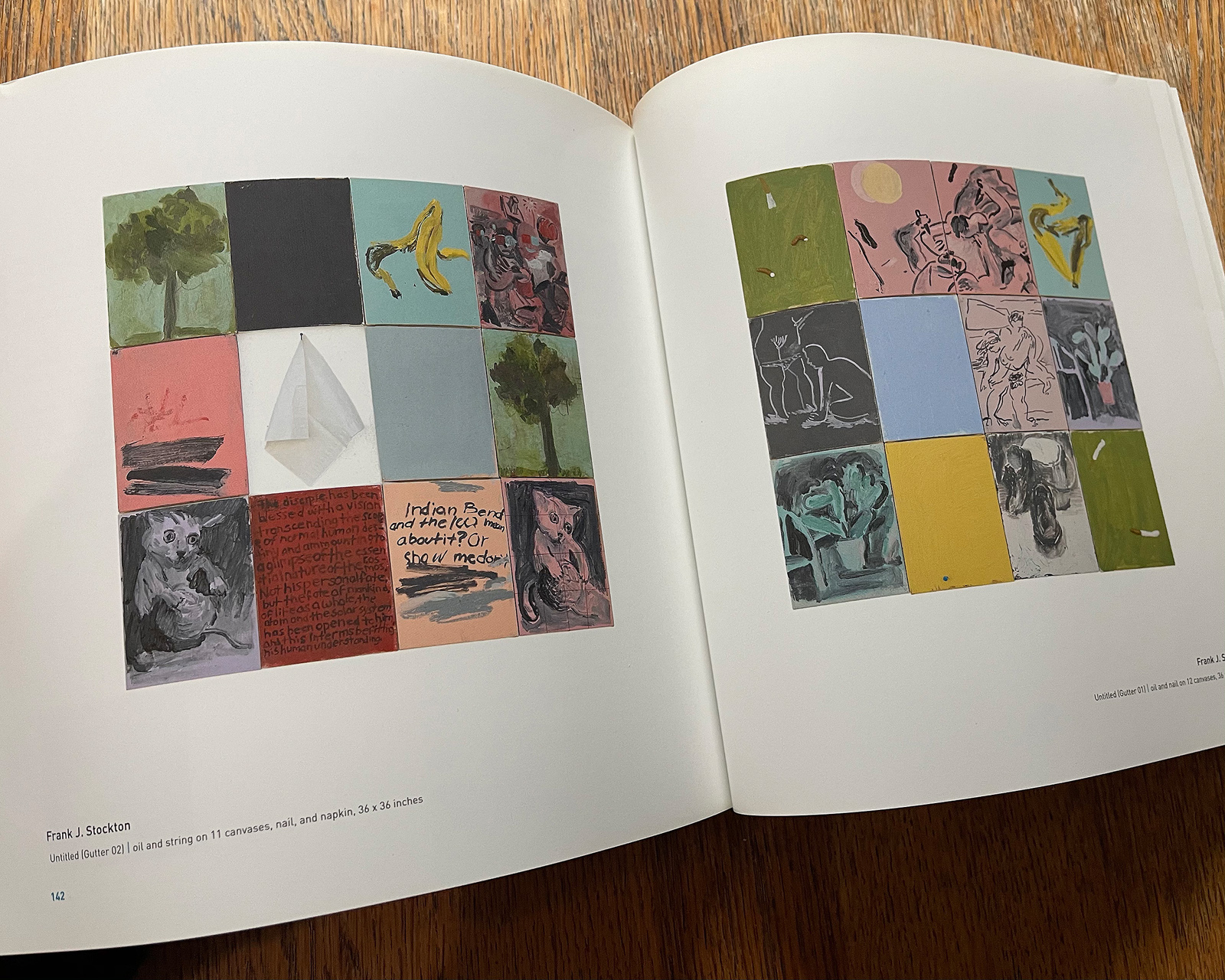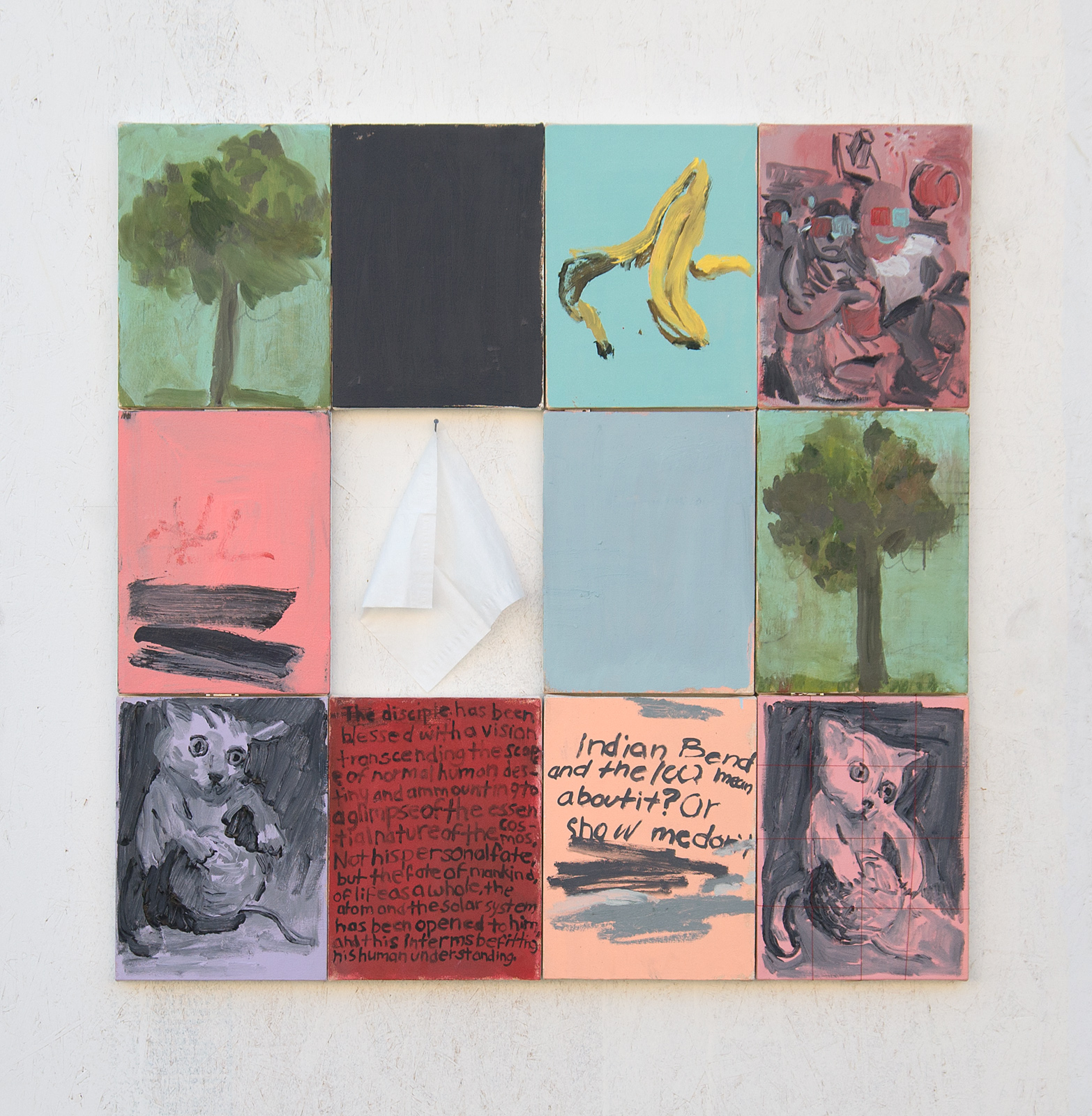 I call some of the recent work “gutter” paintings, which is a reference to the the gap between cells in a comic strip. These larger pieces are constructions of many small canvases clustered into a grid formation that may suggest a spatial, narrative, or symbolic meaning to the viewer.
