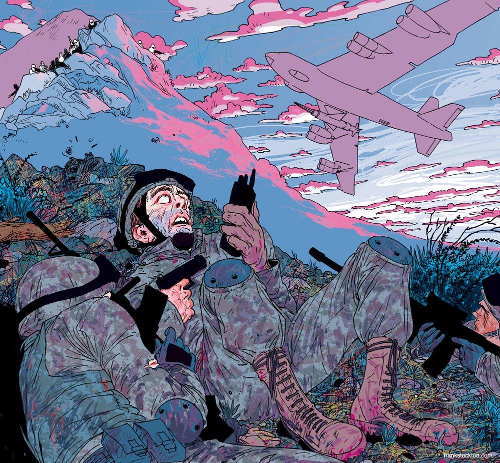 I was drawn to the psychological intensity of the piece, and tried to put some of that into this illustration. I had a lot of fun drawing and coloring this, so I was a little bummed when I found out that the editors decided not to run it, even after several rounds of changes (note: this is my original version), because it didn’t portray the American soldiers in a flattering enough light. I understand, though I was pretty bummed out about it.