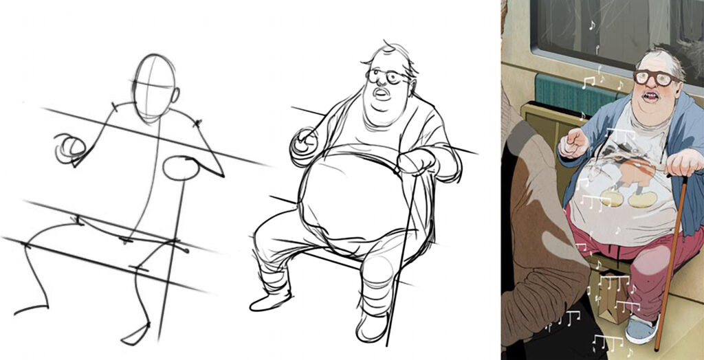 The “story” of this drawing is about a frumpy, disheveled transient-type character addressing someone on the subway. As the drawing progresses from the sketch on the left, the details that are added are all designed to strengthen this idea. Emphasis is put on lines that show off his rolly-polly-like nature.