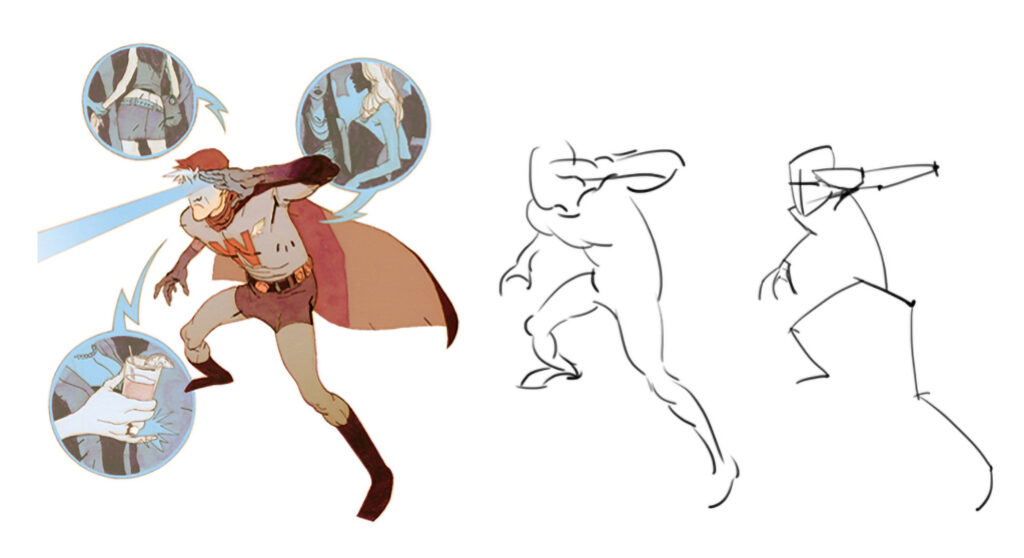 The key to making this work is realizing that there are no limits to what the figure can do when you put it down on paper; as long as you are able to communicate the idea, the possibilities are as endless and free as you permit yourself to imagine.