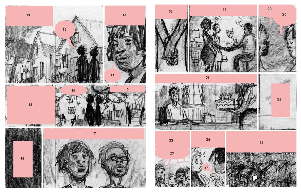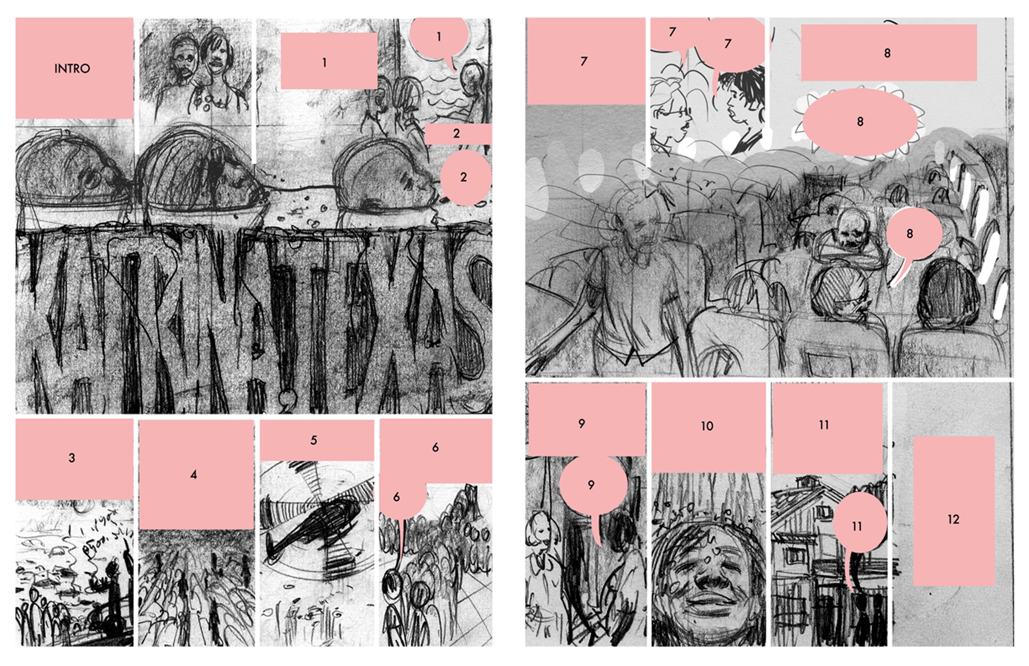 When I went in to color it, I pushed the most saturated parts to the edges of the panel to get the viewer to look at those other parts of the panel, and to balance out the colors for both the page on its own and the spread as a whole.