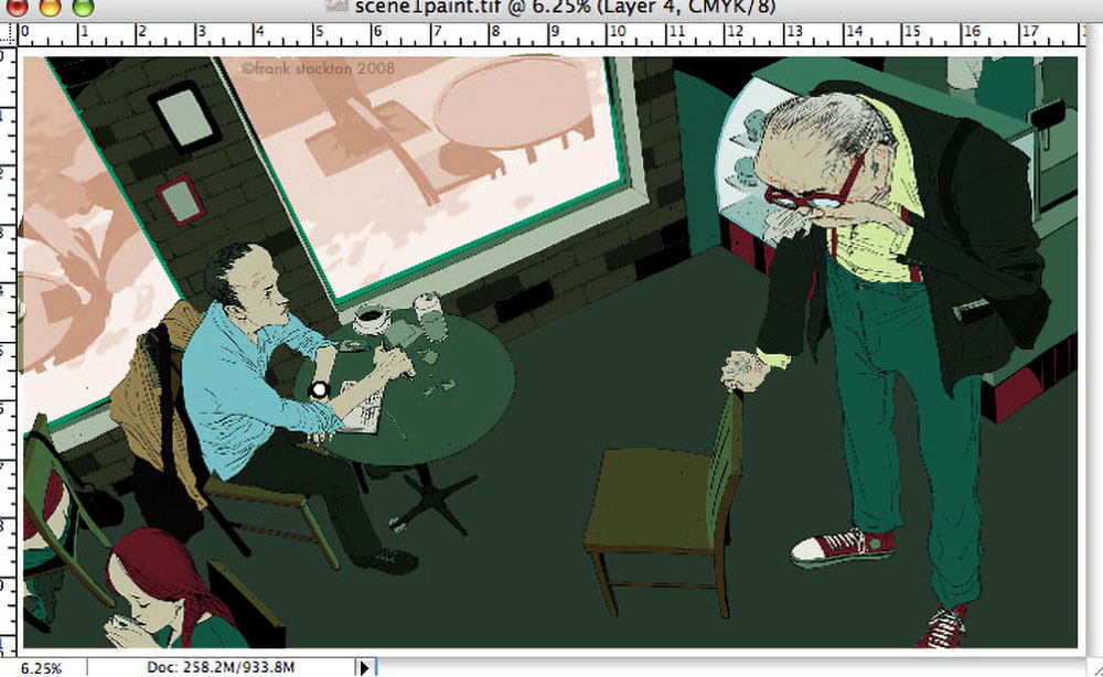 This is a screenshot from early on in the coloring process, when I was trying to find a color scheme I liked. Notice the scene in the window is not yet fully painted.