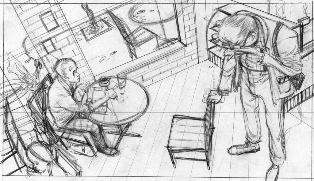 In this scene, the main character (our writer from last week’s post) is meeting with an extremely tall old man who can’t stop wheezing and coughing. From events that happen later in the story, I decided he should look somewhat “artsy” and “creepy,” not unlike a certain archetype of design teachers and artsy administrators I recall walking around campus when I was going to school at Art Center (it’s a great school, but a weird place).